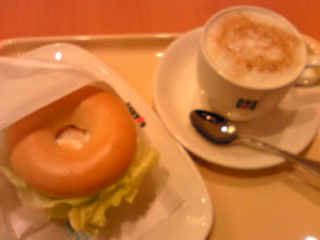 スモークチキンベーグルと黒糖豆乳ラテ。